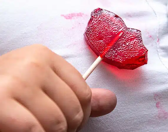Candy Scrape the excess candy material off the surface of the fabric. Rinse in cool water to dilute the stain, and coat stain in detergent without rubbing it in. Allow to sit for several minutes and then launder as normal.
