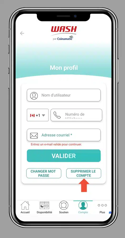 Une fois connecté à l’application WASH-Connect, taper sur Compte, Profil et Supprimer le compte.